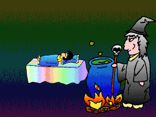 熟睡時,老巫婆開始煮湯藥, 準備將