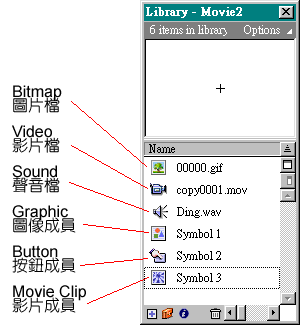元件(Symbol):是一種可以重複利用的元素,設計好的元件,都會放在「元件庫」中。 元件的使用,能使動畫的製作更有效率,且能有效縮減動畫檔案的大小。其種類如下圖所示