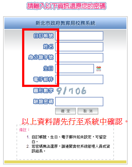 2.如果忘記密碼,可輸入自訂帳號、姓名、身分證字號、生日、電子郵件及驗證的圖形數字,即可還原密碼為身分證字號。