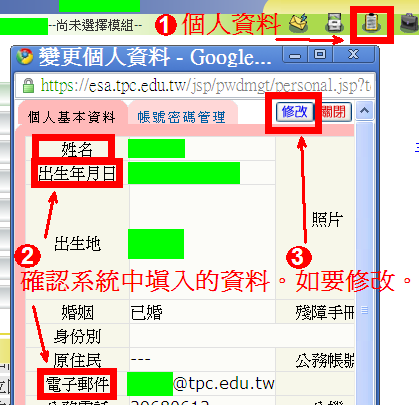 3.以上資料請同仁們先行至校務行政系統中"個人資料修改"功能裡確認,以備不時之需。